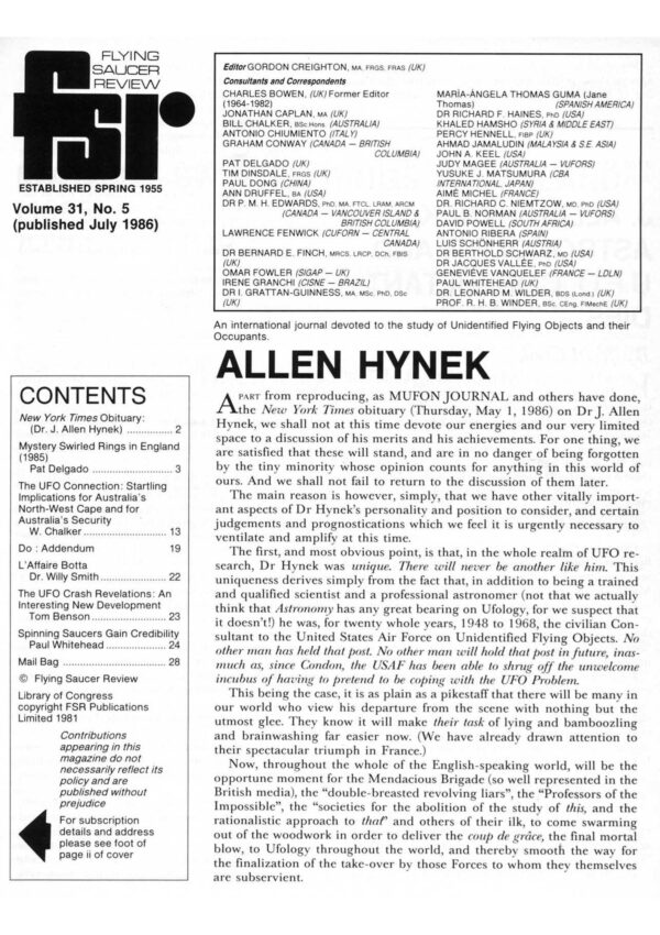 Hynek dies(1986),FSR1986V31N5,Cook