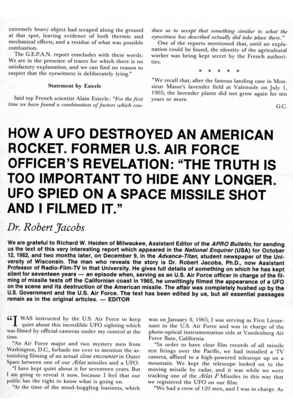 Jacobs,U.S.missile destroyed by UFOs,1965,California,FSR83V29N1