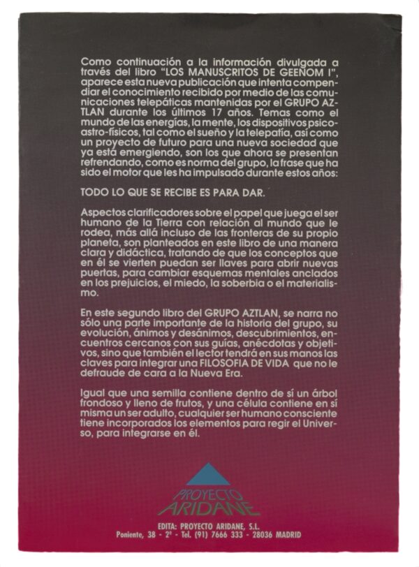 Como continuación a la información divulgada a través del libro “LOS MANUSCRITOS DE GEENOM I”, aparece esta nueva publicación que intenta compendiar el conocimiento recibido por medio de las comunicaciones telepáticas mantenidas por el GRUPO AZTLAN durante los últimos 17 años. Temas como el mundo de las energías, la mente, los dispositivos psico-astro-físicos, tal como el sueño y la telepatía, así como un proyecto de futuro para una nueva sociedad que ya está emergiendo, son los que ahora se presentan refrendando, como es norma del grupo, la frase que ha sido el motor que les ha impulsado durante estos años:
